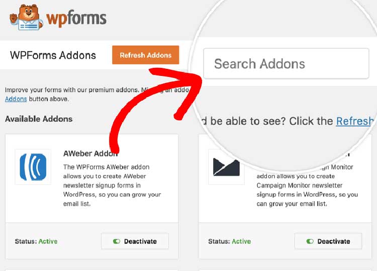 The Zapier plugin will be available after the installation of WPForms. Choose WPForms, then Addons from the WordPress dashboard.