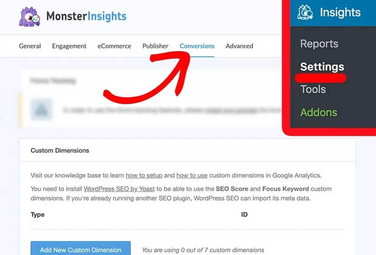 ● Navigation: Insights>Settings Once you’ve found Custom Dimensions, click the Conversion tab to access the menu.